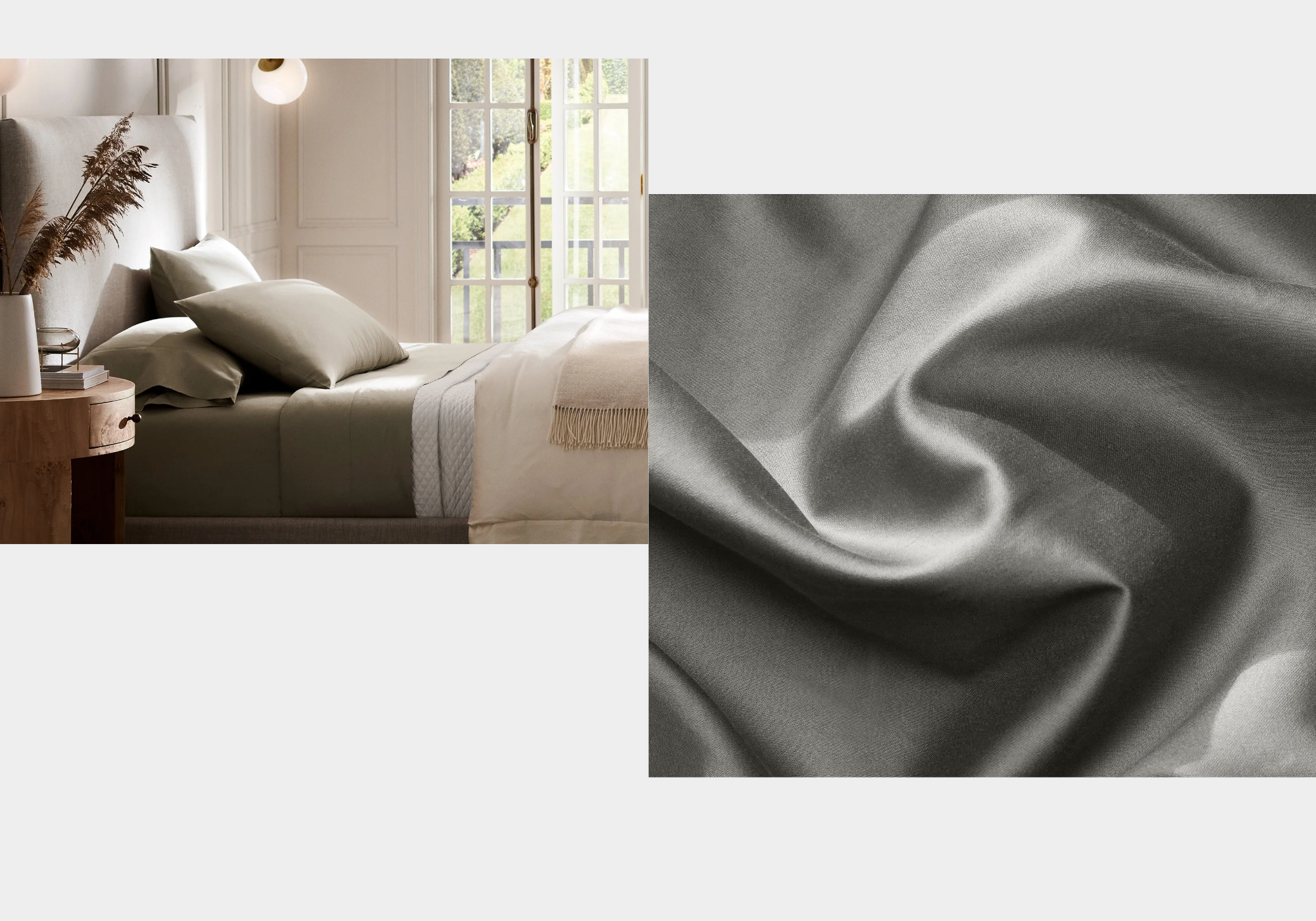 Designed for a smoother, more refined sleep, this fabric is woven in a sateen structure that enhances its silky touch while maintaining balanced breathability. The result is a soft, fluid drape with a polished finish, offering comfort that feels light, cooling, and effortlessly luxurious night after night.